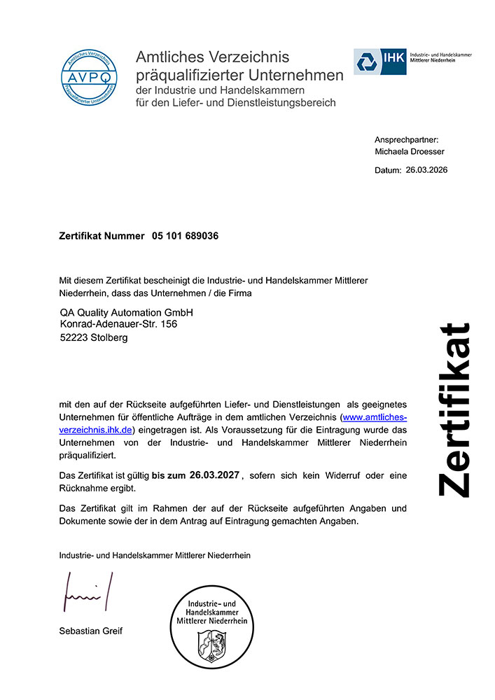 Als präqualifiziertes Unternehmen sind wir von der der Industrie- und Handelskammer Mittlerer Niederrhein als geeignetes Unternehmen für öffentliche Aufträge zertifiziert.